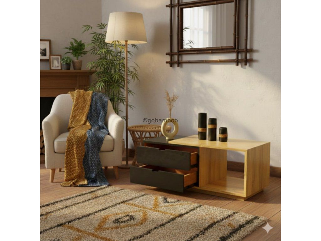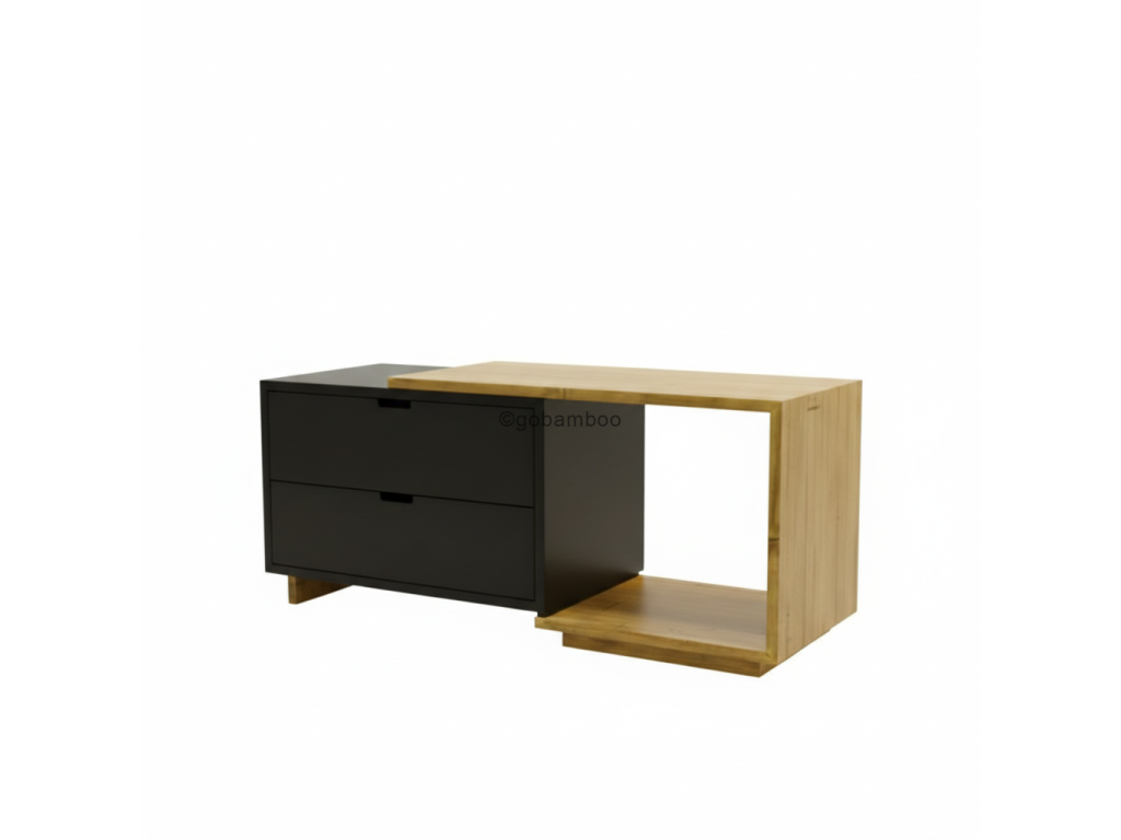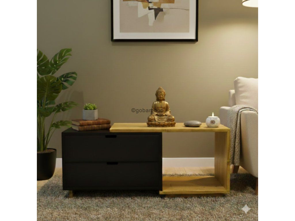 Prvky vyrobené z lisovaného bambusu přinášejí teplou, přírodní atmosféru, kterou elegantně vyvažují tmavé, moderní povrchy. Právě tento kontrast dodává stolku jedinečný, prémiový vzhled – je zároveň přirozený, minimalistický i charakteristický.