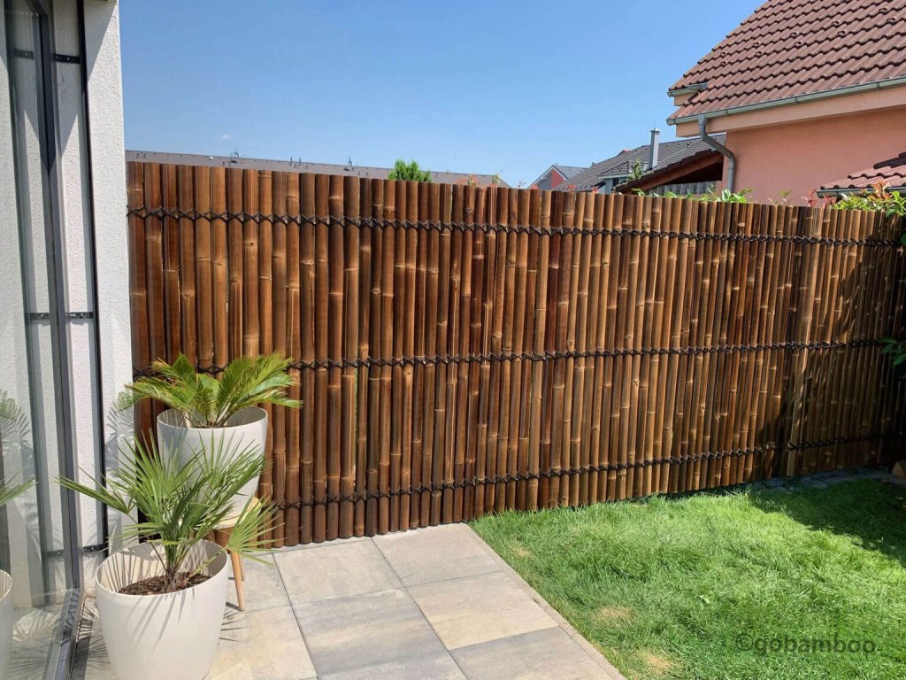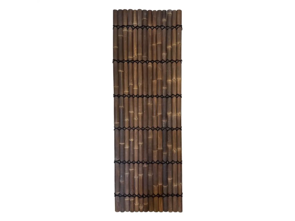 Půlkruhový bambusový plot dodá vaší zahradě nebo terase krásný a exotický nádech. Půlkruhové tmavohnědé bambusové tyče v tomto plotu mají průměr 6 až 8 cm a jsou spojeny bambusovými lamelami a přírodním černým lanem z kokosových vláken, které prochází celou šířkou plotového panelu.