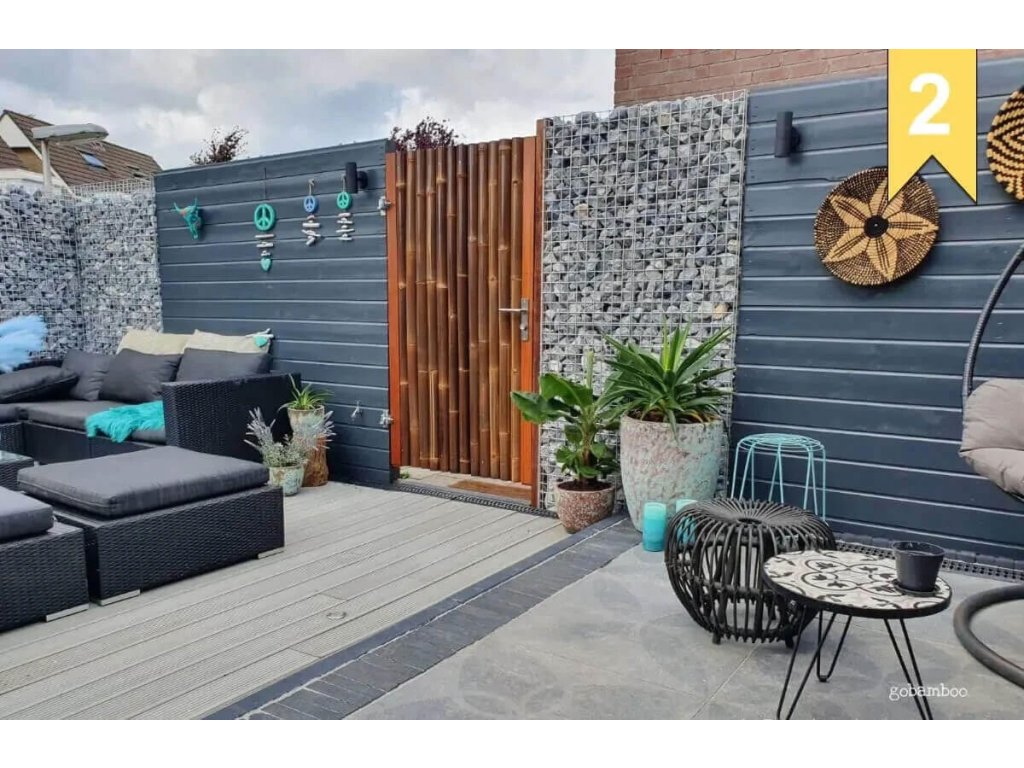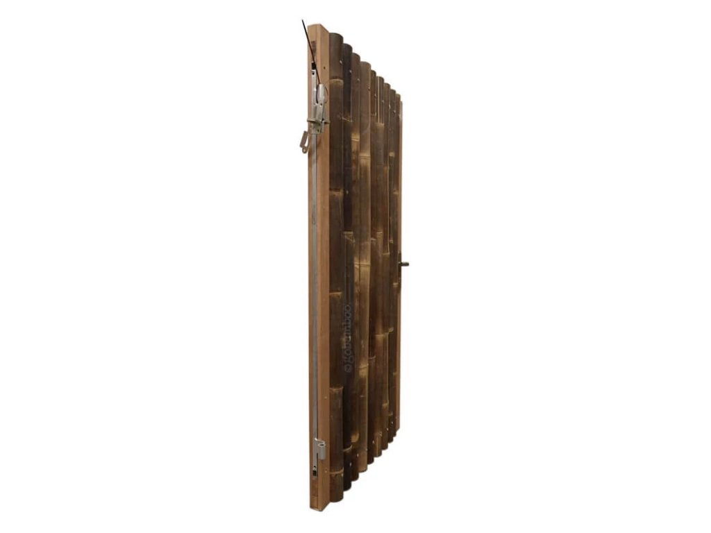 Tato obrovská bambusová brána o šířce 100 cm a výšce 180 cm nebo 200 cm je vyrobena v Holandsku a má mimořádně vysokou kvalitu. Základna těchto dveří tvoří pozinkovaný ocelový rám a boky jsou pokryty deskami z tvrdého exotického dřeva Azobe. Na výběr je možnost levé nebo pravé brány (na obrázku vidíte levou). Obě strany této bambusové brány jsou pokryty 6 až 8 cm širokými obloukovitými tyčemi z bambusu Tali z Indonésie. Celková tloušťka těchto bambusových dveří je přibližně 10 cm. Tato bambusová brána Gigant z bambusu Tali je speciálně navržena tak, aby dokonale ladila v kombinaci s našimi panelovými ploty z bambusu a je dodávána s masivními panty, včetně dveřního zámku z nerezové oceli s klíčem a západkou. Bambusová brána se snadno instaluje mezi 2 sloupky z tvrdého dřeva (objednává se samostatně).